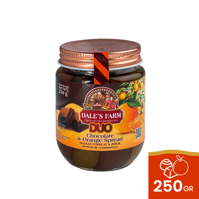 Dikemas eksklusif dalam toples kaca, Dale;s Farm Duo Peanut Butter & Chocolate merupakan perpaduan selai kacang & cokelat lezat berkualitas tinggi. Dales Farm Duo juga di perkaya dengan lemak tak jenuh, serat, dan protein tinggi yang dipercaya dapat membantu melancarkan sistem pencernaan.